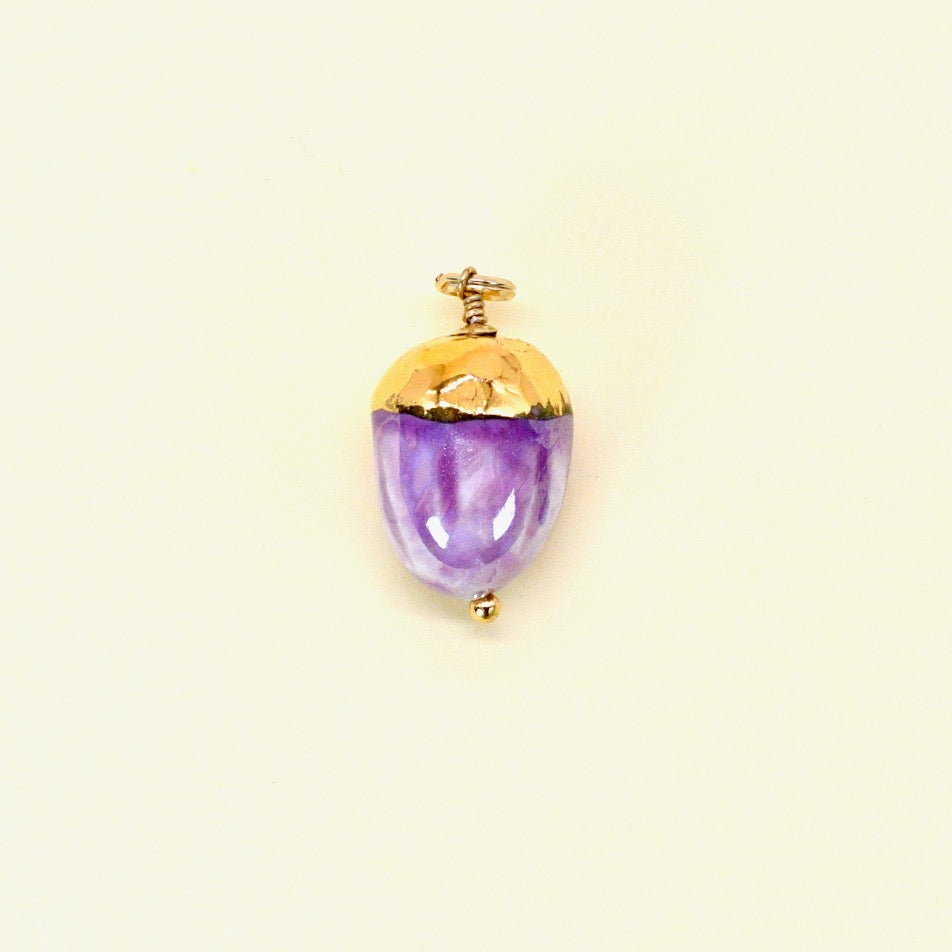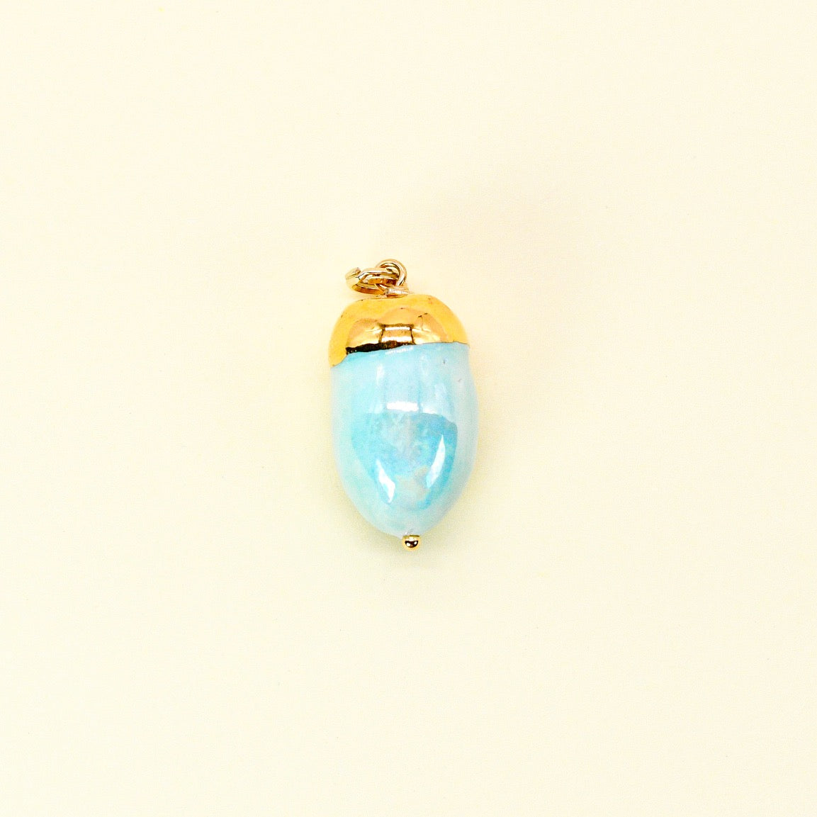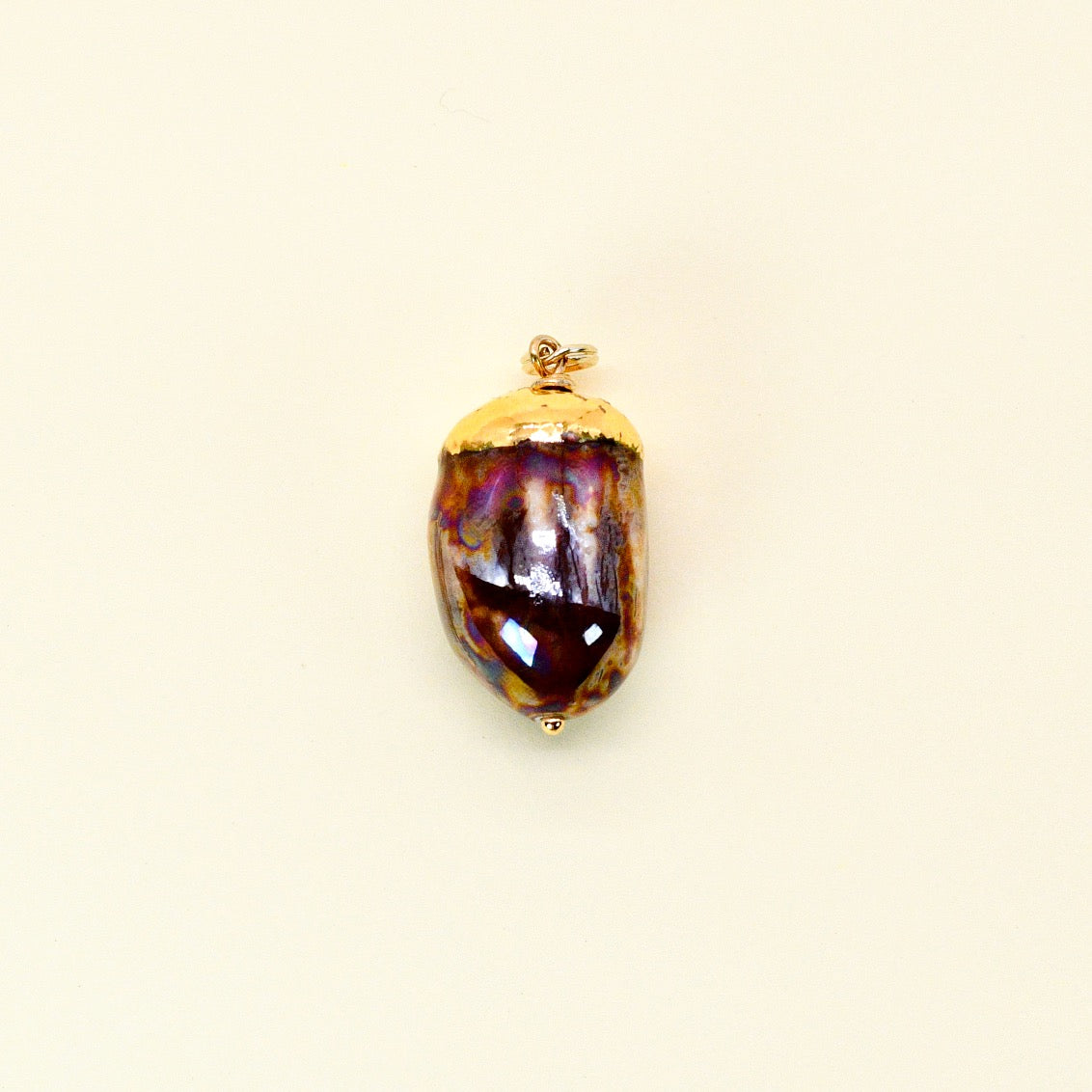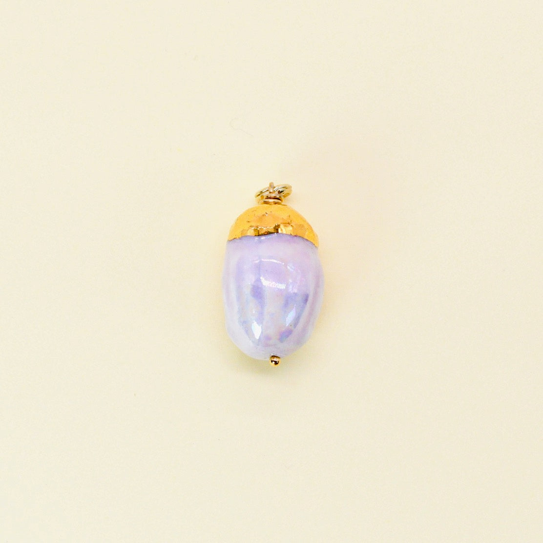 Sculpted by hand to resemble a real acorn seed, each porcelain pendant is a one-of-a-kind treasure, glazed in soft pastel tones and adorned with a luminous mother of pearl finish. The tip and edges shimmer with either 24K gold or platinum detailing, catching the light with every movement.