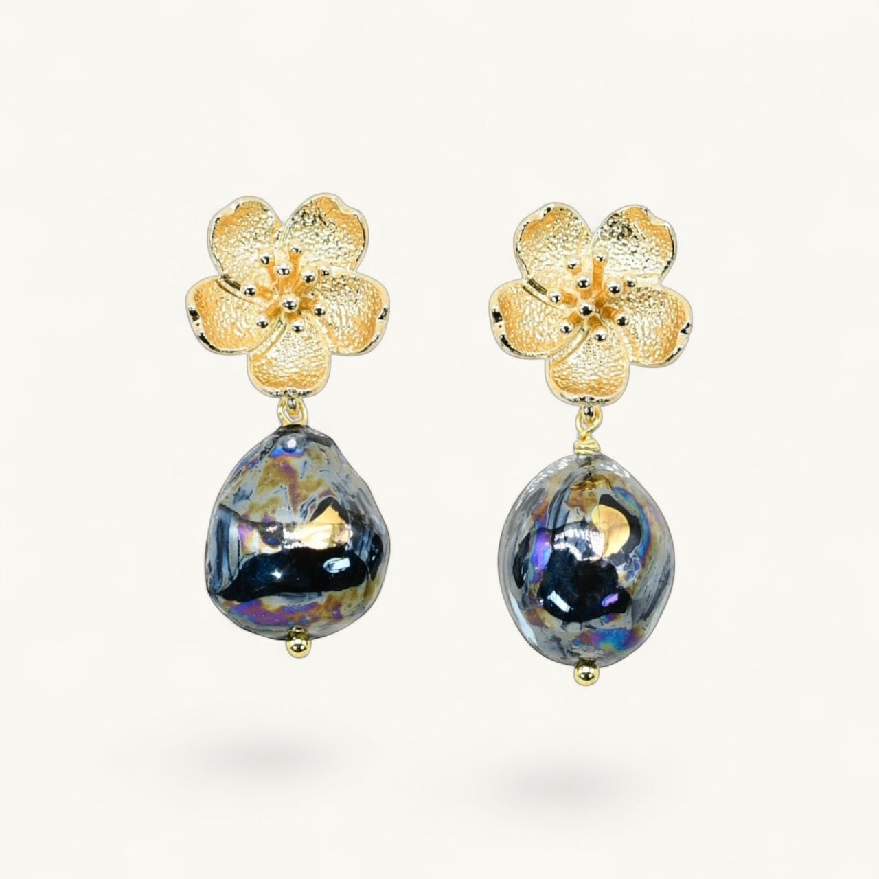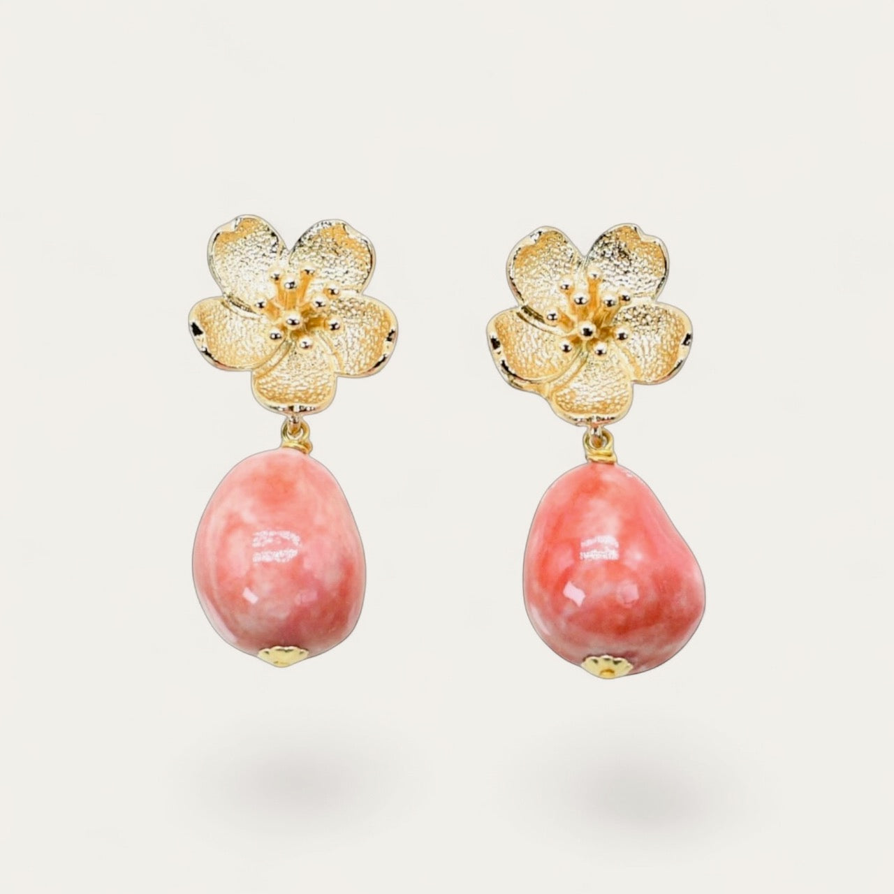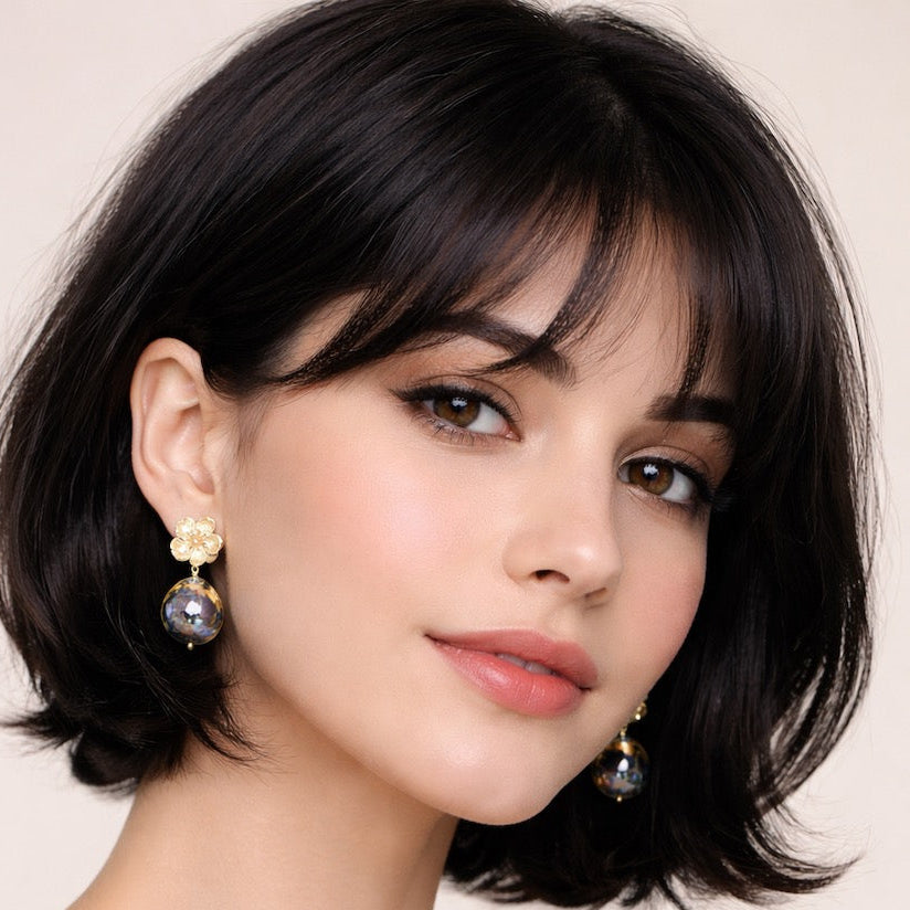 Our Bella Floral Porcelain Earrings are a celebration of femininity, colour, and refined craftsmanship. Each pair begins with a delicately sculpted gold-toned floral stud, inspired by a blooming garden in early spring — a symbol of love, renewal, and enduring beauty. Suspended beneath, a hand-formed porcelain drop creates a soft yet striking silhouette, making these earrings both romantic and effortlessly elegant.