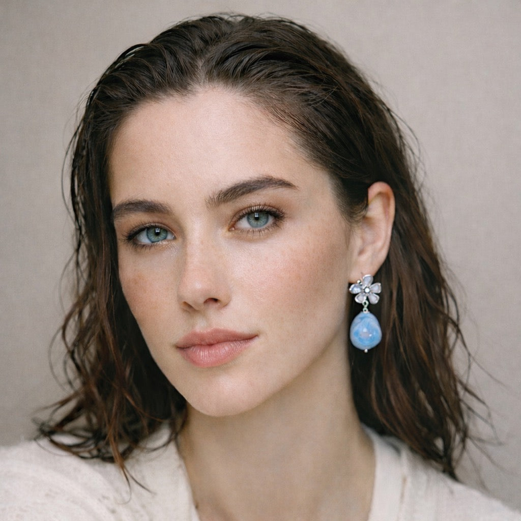 The soft shimmer of the silver setting combined with the glossy porcelain teardrop creates beautiful movement and light reflection, enhancing both everyday outfits and special occasion looks. Whether styled for weddings, anniversaries, romantic dinners or summer events, these floral drop earrings bring effortless refinement and artistic individuality — a true celebration of slow luxury and wearable art.