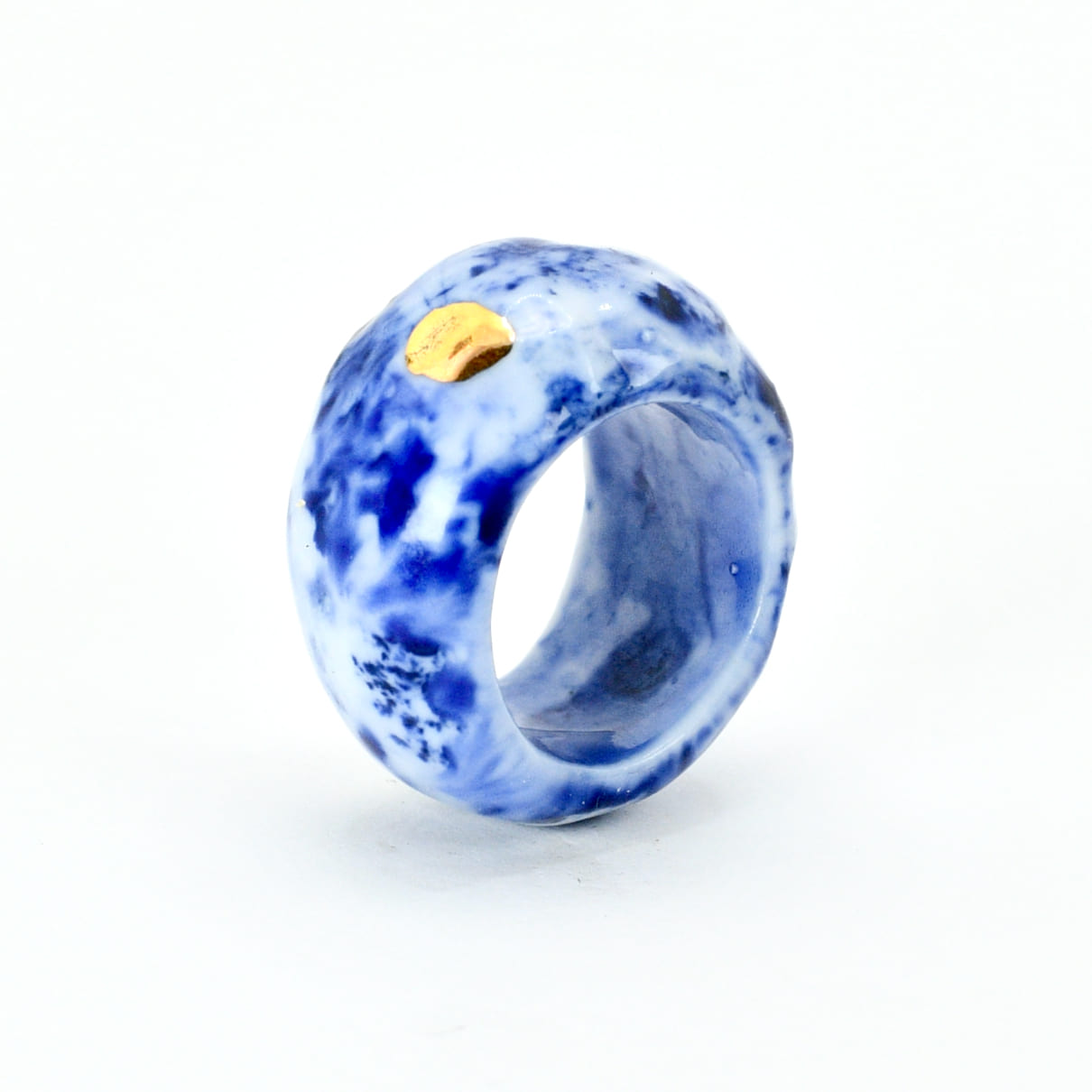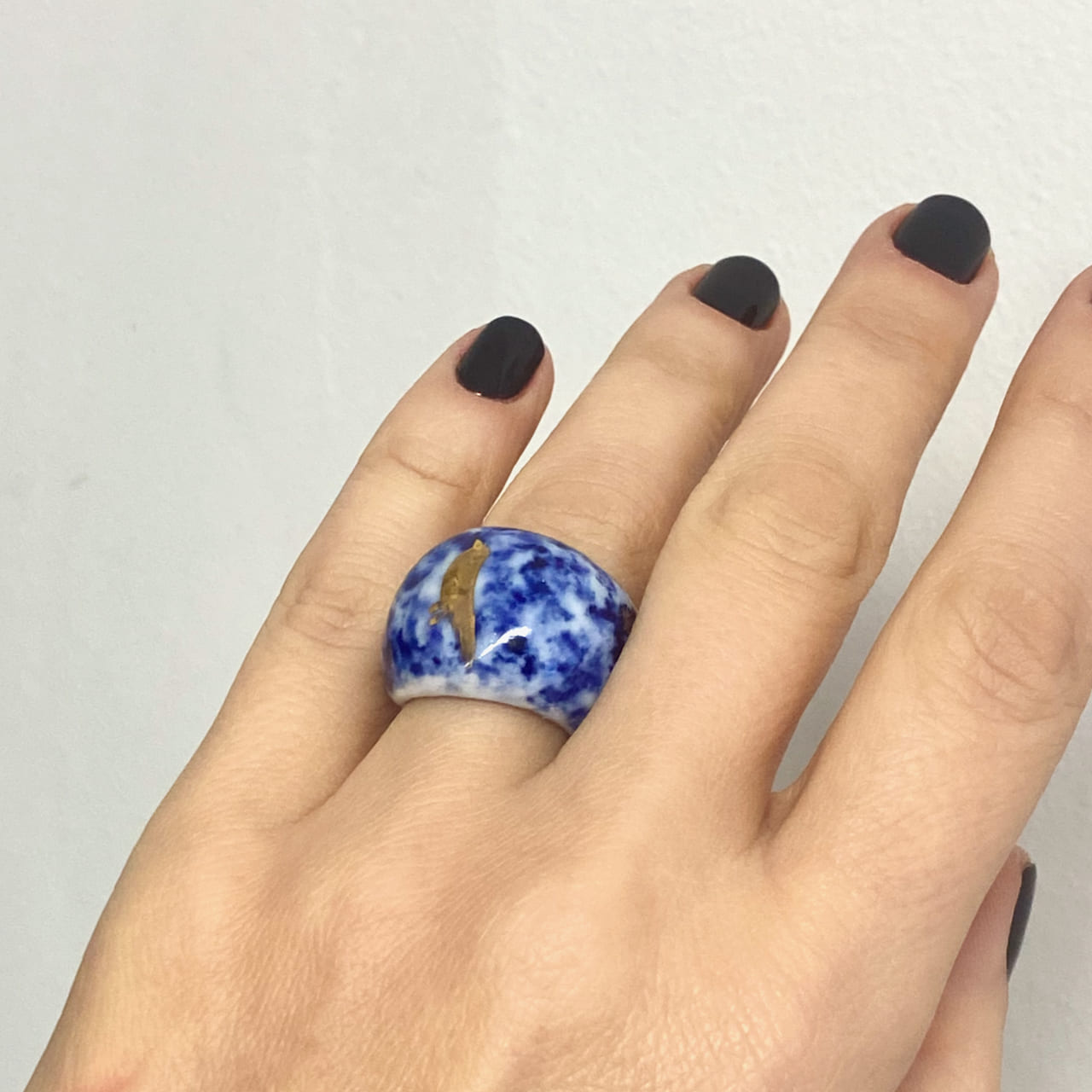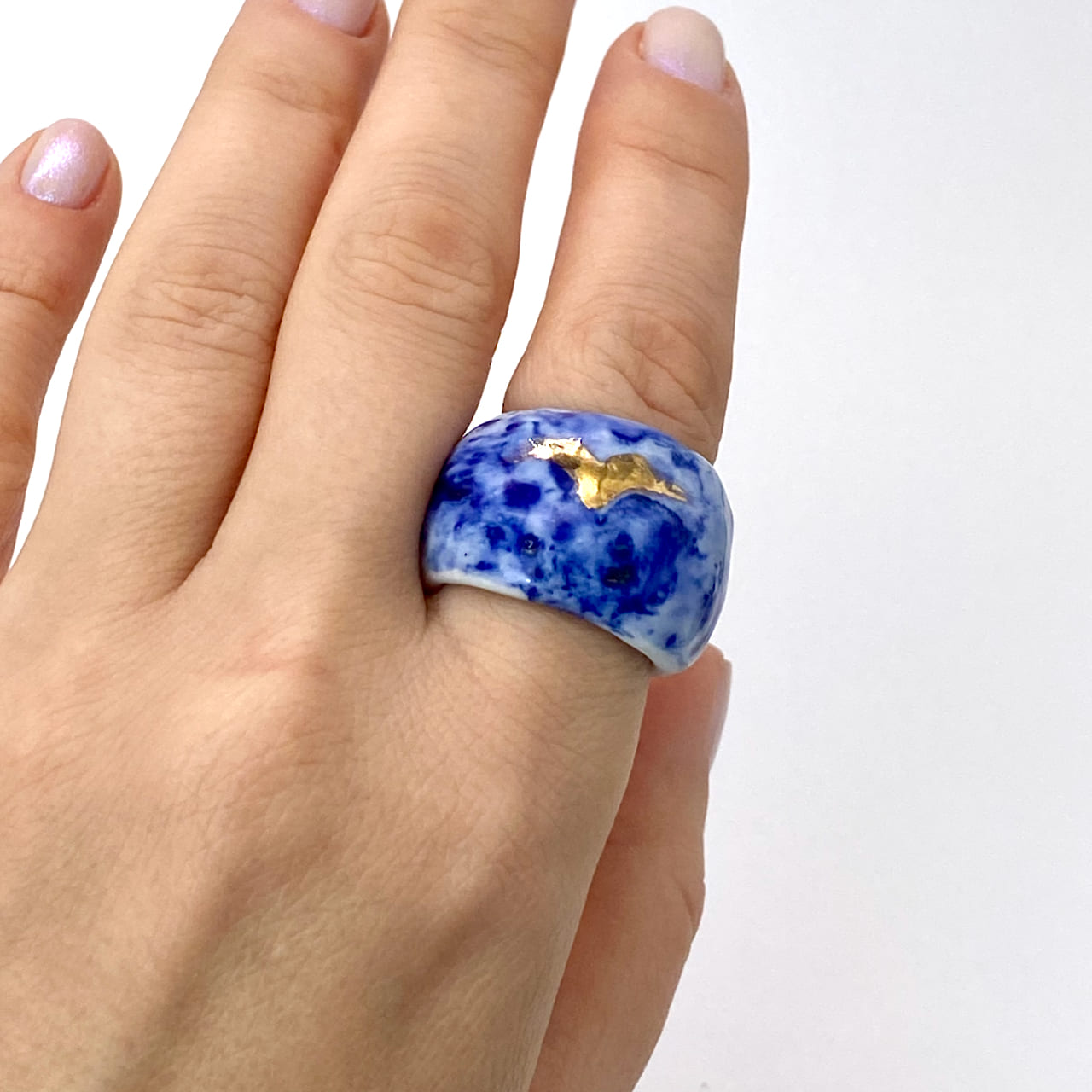 Glazed in a deep, glimmering cobalt blue and adorned with graceful golden brushstrokes, the Cobalt Blue Ocean Ring is a timeless piece of art you can wear. Handcrafted from fine porcelain, this bold yet elegant ring makes a sophisticated statement with its rich color and sleek, oval shape that ensures a comfortable fit despite its substantial width.